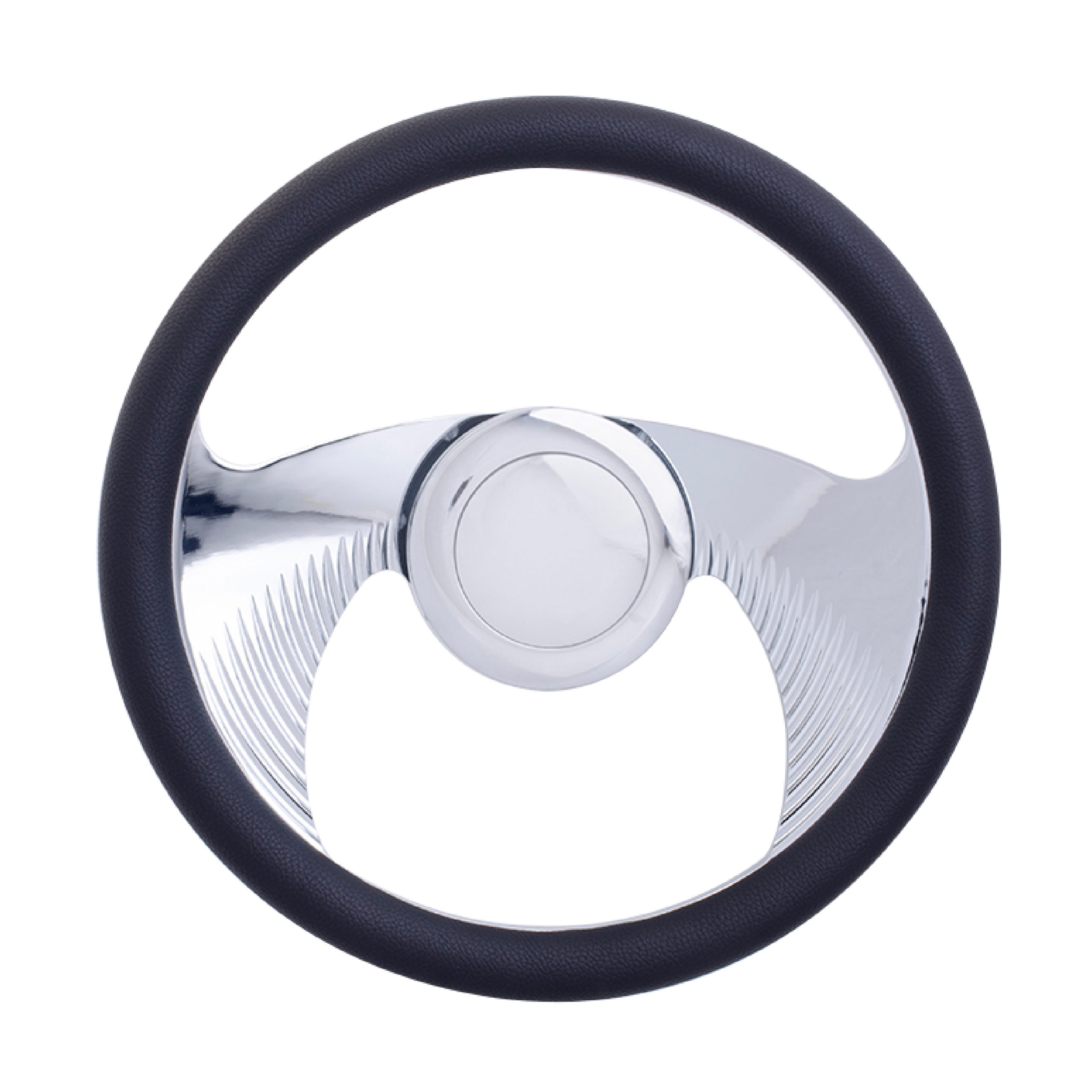 CNC machined billet aluminum design with a chrome finish and a leather half wrap. 2″ steering wheel depth and fits most GM 9 hole steering wheel adapters. *STEERING WHEEL ONLY. DOES NOT INCLUDE HORN BUTTON OR STEERING WHEEL ADAPTER.